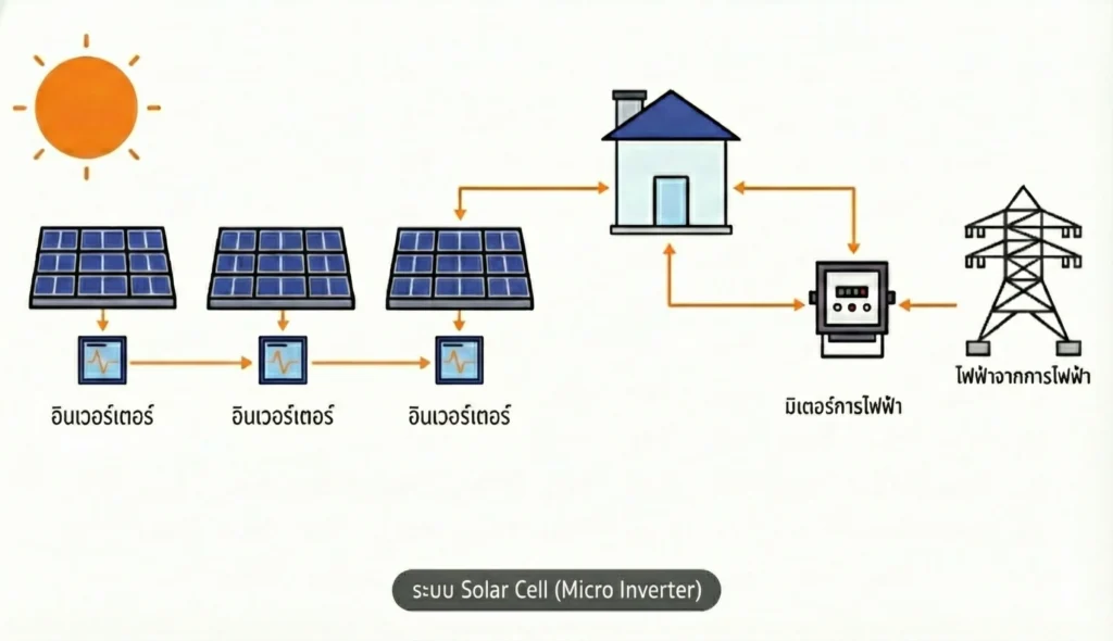 จึงมีนวัตกรรม Micro inverter ขึ้นมา โดยเป็นอินเวอร์เตอร์ขนาดเล็กติดตั้งไว้ใต้แผงโซลาเซลล์แต่ละแผง การทำงานแต่ละแผงจึงเป็นอิสระต่อกัน หากมีแผงใดแผงหนึ่งขัดข้องหรือมีเงาบดบัง โซลาเซลล์แผงอื่นๆ ยังสามารถทำงานได้เต็มประสิทธิภาพ ภาพรวมการผลิตพลังงานไฟฟ้าจึงสูงกว่า String inverter